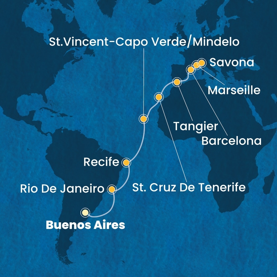 Jídlo a pití: Na palubě je 12 barů a 6 restaurací. V hlavní restauraci ochutnejte menu od šéfkuchařů s Michellinskými hvězdami, vyražte na drinky do Aperol Spritz baru nebo na ochutnávku vín do Camelot Wine baru.