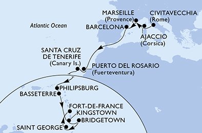 Doprava do přístavu je vlastní. V případě zájmu pomůžeme zajistit dopravu. V některých přístavech je možné zarezervovat parking vašeho vozu po dobu plavby. Lodní společnost nabízí balíček MSC Hotels & Flights, který zahrnuje letenku, ubytování před plavbou, zpáteční transfery a plavbu. Navíc, když se lety zpozdí, nebo zruší, tak lodní společnost navrhne náhradu, tak abyste se na svojí plavbu dostali. MSC Hotels & Flights je k dispozici pouze u vybraných plaveb, nabídku předložíme na vyžádání.